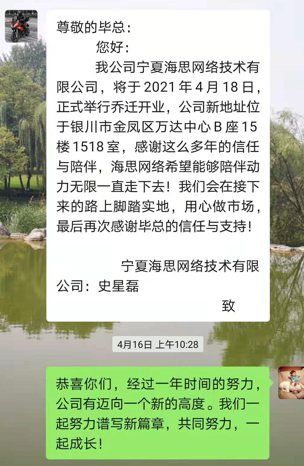 寧夏海思網(wǎng)絡(luò)史總表示:感謝畢總多年的信任、陪伴與支持,海思網(wǎng)絡(luò)希望能夠陪伴萬家燈火一起走下去!我們會在接下來的路上腳踏實(shí)地,用心做市場!