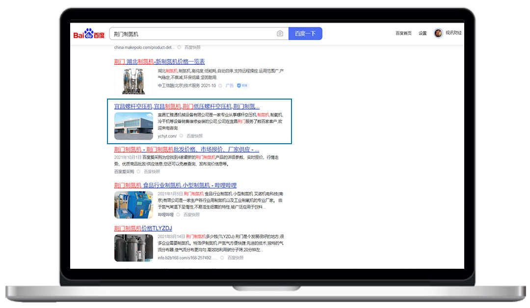 匯雅通官網(wǎng)上線不到1個月,成功被搜索引擎收錄,而且關(guān)鍵詞:荊門制氮機、宜昌螺桿空壓機、宜昌干燥機,均在百度首頁展示。